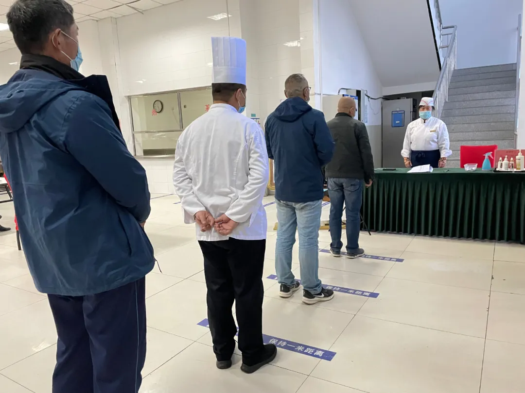 餐厅设置一米线,全员餐前测温登记,进行手部消毒。