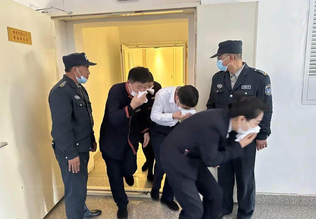 随着警报声响起,演练活动正式开始。酒店员工迅速做出反应,在安保人员的指引下,用湿毛巾捂住口鼻,弯着腰,相互照应,按照应急预案的指定路线向安全出口进行疏散逃生。