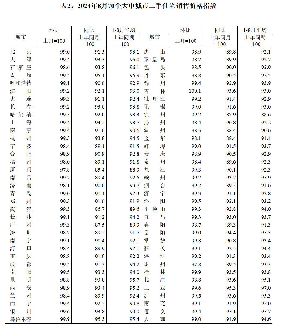 国家统计局近日发布的《70个大中城市商品住宅销售价格变动情况》显示,2024年8月份70个大中城市中新建商品住宅和二手住宅销售价格环比上涨城市分别有2个和1个,同比上涨城市分别有2个和0个,均与上月持平。
