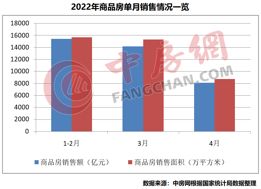 数据显示,1-4月份商品房销售面积39768万平方米,同比下降20.9%;其中,住宅销售面积下降25.4%。商品房销售额37789亿元,下降29.5%;其中,住宅销售额下降32.2%。