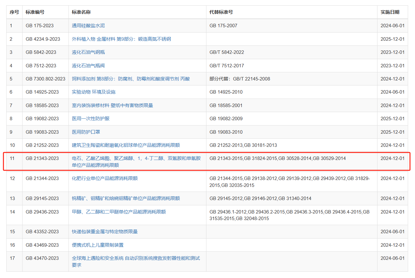 强制性国家标准GB 21343-2023《电石、乙酸乙烯酯、聚乙烯醇、1,4-丁二醇、双氰胺和单氰胺单位产品能源消耗限额》批准发布